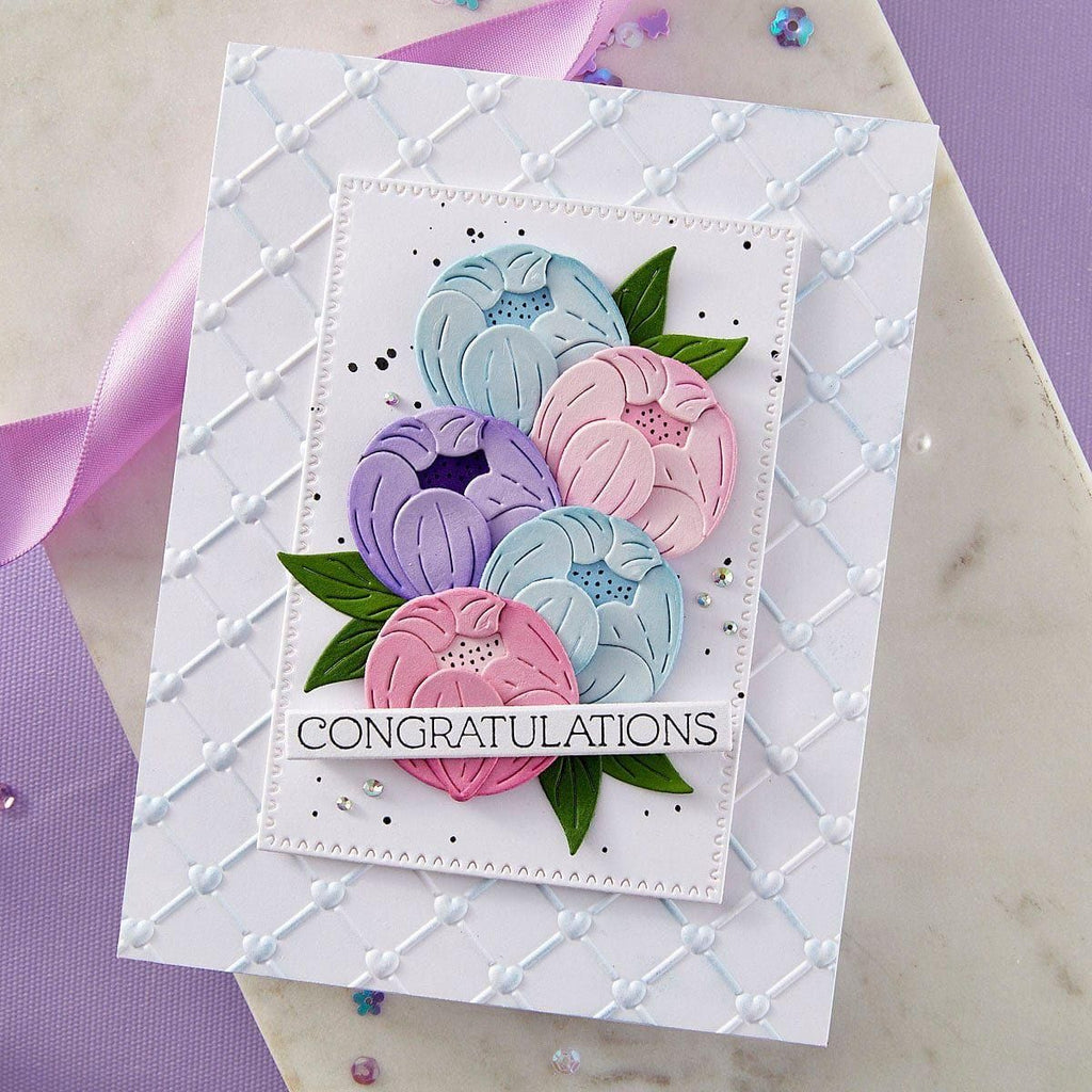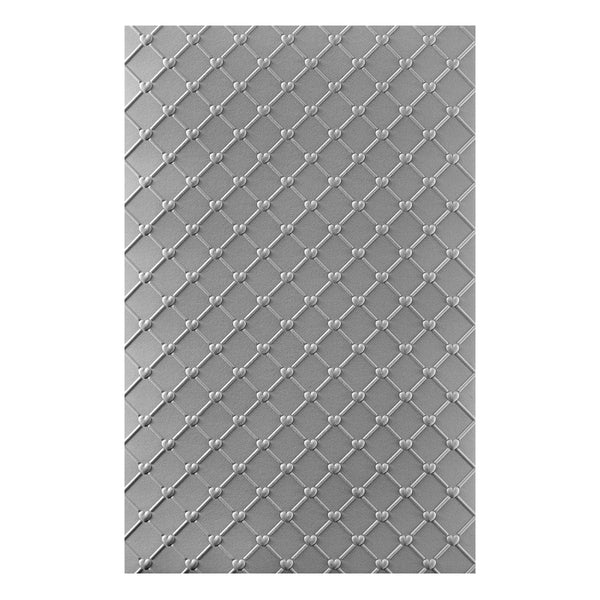 Cross My Heart 3D Embossing Folder is a 5.50 x 8.50-inch embossing folder filled with a diamond-shaped repeat pattern. Sweet tiny hearts are placed on the intersecting lines. What a perfect addition to mix and match with the other sets in this collection!