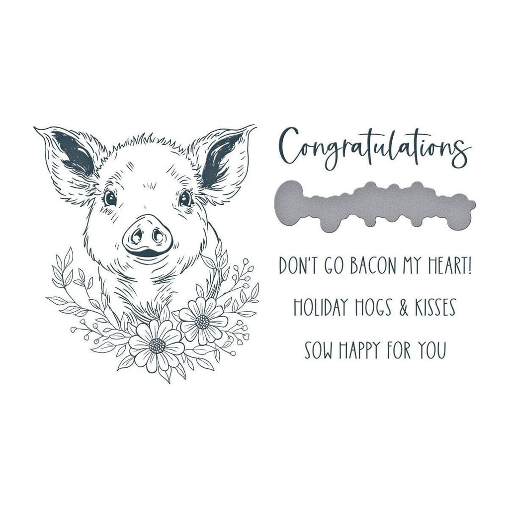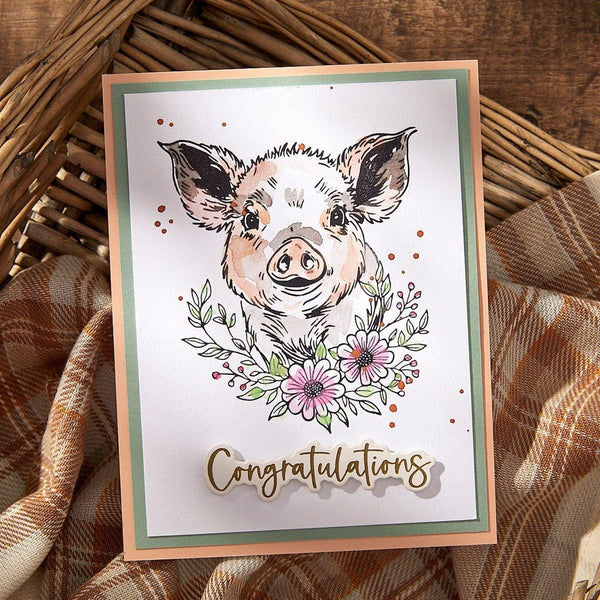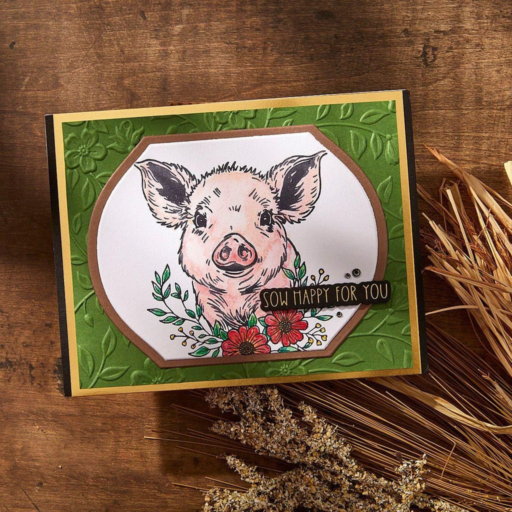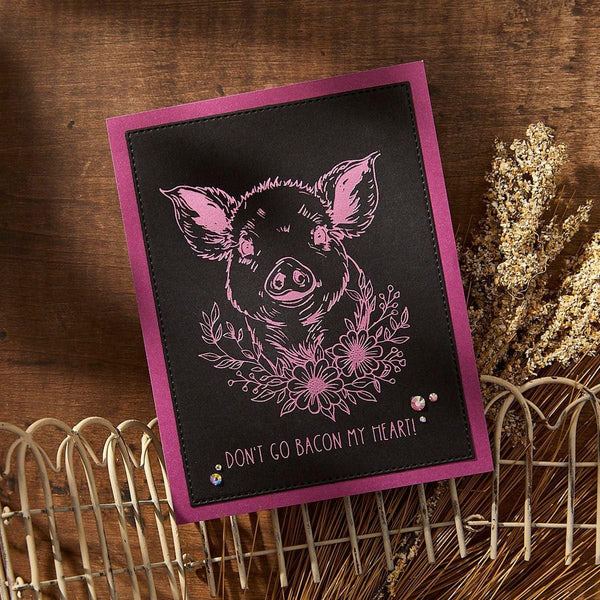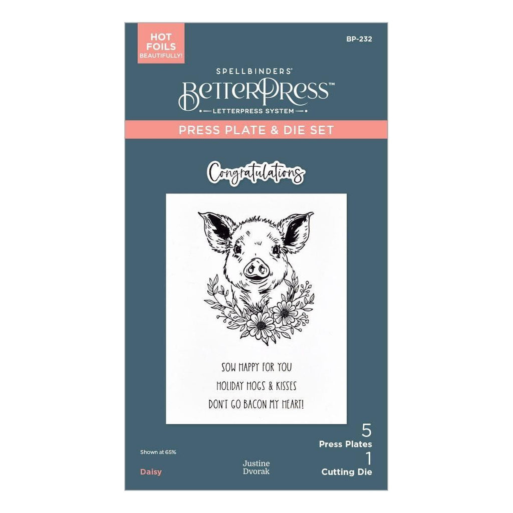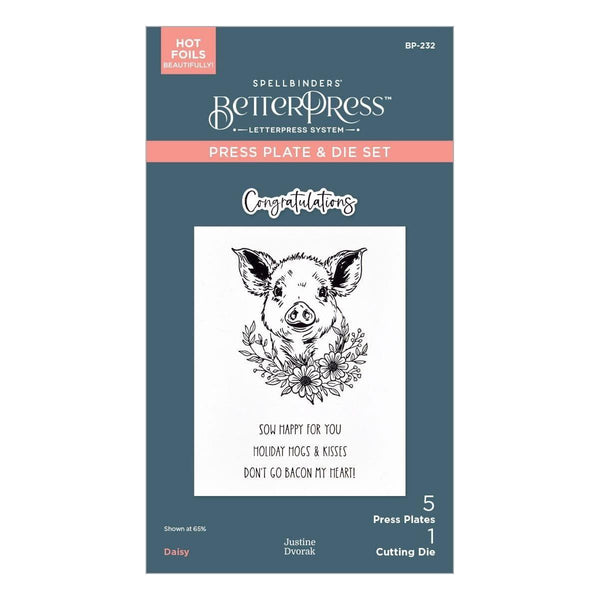 Daisy BetterPress Plate & Die Set is from the Justine's Farm Collection by Justine Dvorak. Letterpress an adorable pig named Daisy framed in a lovely floral garland! She is celebrating with the included Congratulations plate that can also be cut with its matching die. Three other sentiment plates are included as well: Don’t Go Bacon My Heart, Holiday Hogs & Kisses, and Sow Happy for You. Ink the plates with the BetterPress Ink to be pressed against the BetterPress Cotton Card Panel and Sheets for a crisp letterpress design.