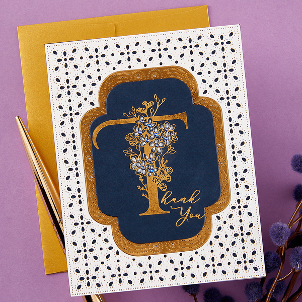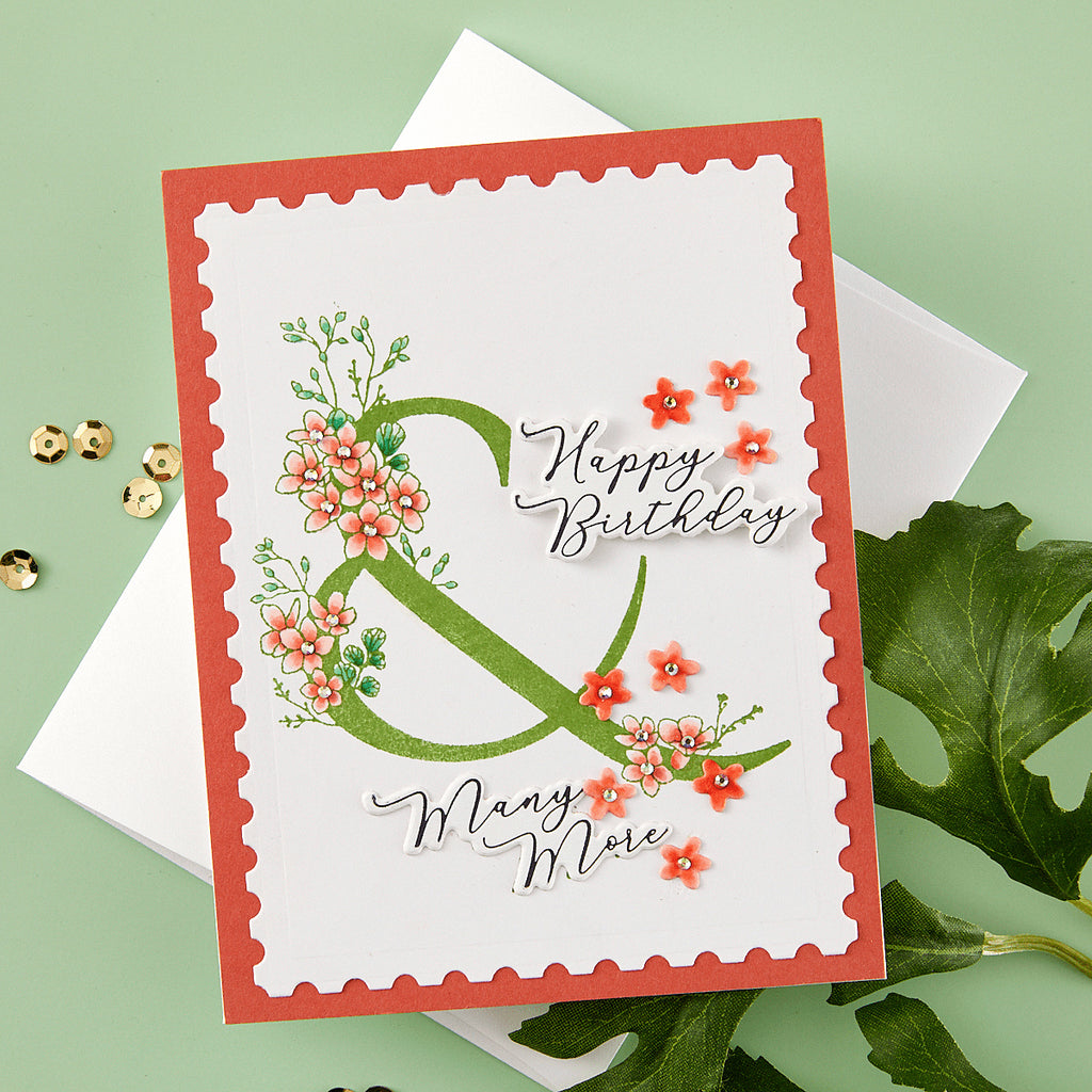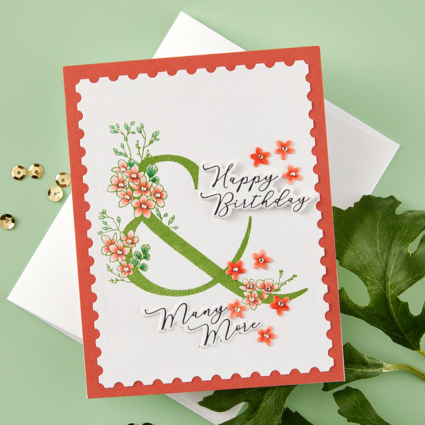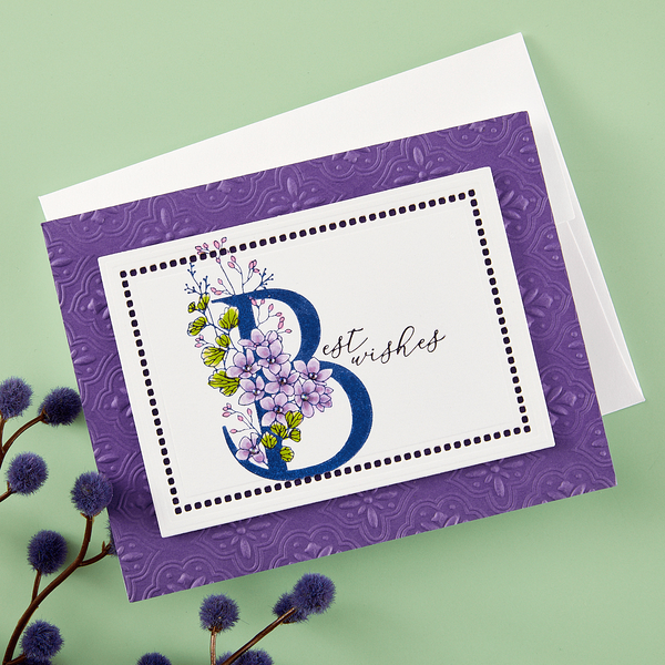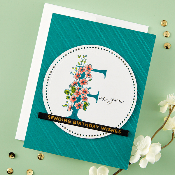 Use the BetterPress Floral Alphabet on its own or with the sentiment. Center the letter and sentiment on an A2-size (4.25 x 5.5-inch) card base for a lovely focal point design. Refer to images for placement recommendation.