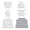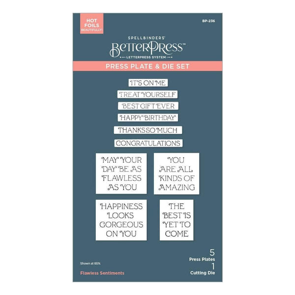 Flawless Sentiments Press Plate & Die Set are part of the Gorgeous You Collection. This set of five press plates and one thin metal cutting die impresses four encouraging sentiments and a list of six short greetings. The thin metal die cuts the list of short sentiments all at once…use one, all or save the rest for later. Ink the plates with the BetterPress Ink to be pressed against the BetterPress Cotton Card Panel and Sheets for a crisp letterpress design.