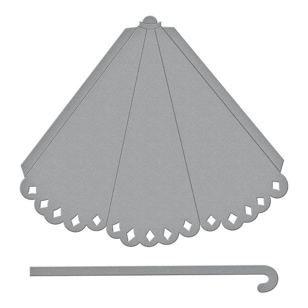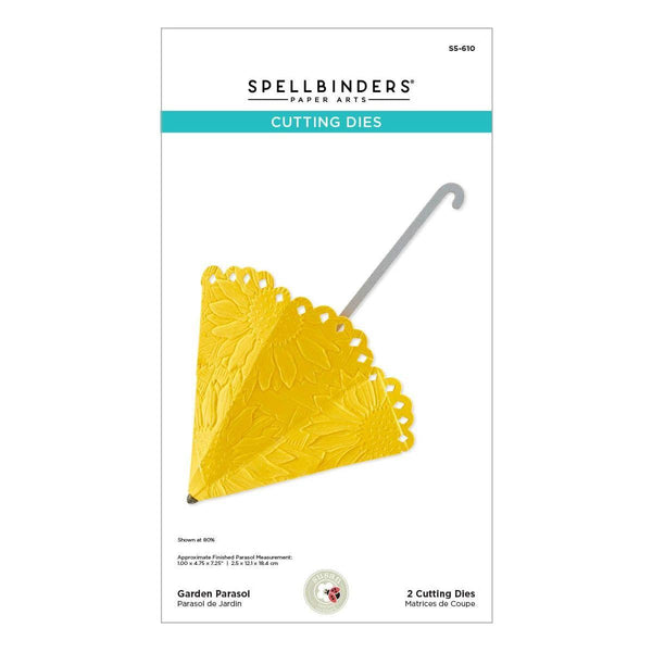 Garden Parasol Etched Dies are part of the Birds & Bees Garden Collection by Susan Tierney-Cockburn. This set of two thin metal cutting dies makes a sweet parasol. It’s so fun and brings a little whimsy to any project. Garden parasol assembled measures 1.00 x 4.75 x 7.25 in./2.50 x 12.10 x 18.40 cm