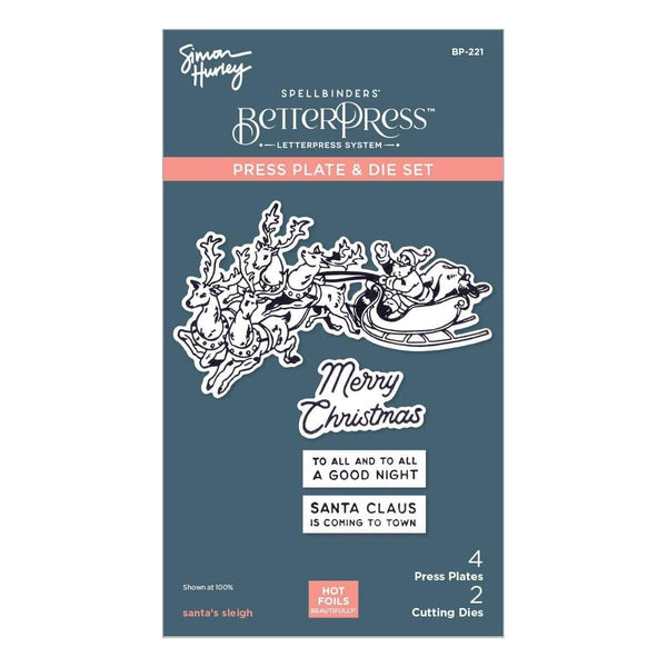 Santa's Sleigh Press Plate & Die Set is part of the Glad Tidings Collection by Simon Hurley. Create a sweeping vintage style Santa flying through the air with this set of four press plates and two coordinating dies. With four included sentiments, you'll find just the right message to accompany this jolly fellow. The dies cut out Santa in his sleigh as well as the Merry Christmas message. Create classic Christmas cards in no time with this fun set!Ink the plates with the BetterPress Ink to be pressed against the BetterPress Cotton Card Panel and Sheets for a crisp letterpress design.