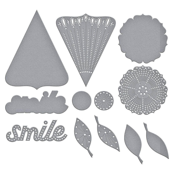 Stitched Petal Bloom Etched Dies are part of the Storytelling by Spellbinders Scrapbooking Collection and has a set of 12 thin metal cutting dies. When assembled, it makes a magnificent floral blossom full of wonderful details! The petal, leaf, and flower center inserts cut intricate patterns to act as a guide for stitching with embroidery floss and needle. Or use the designs as is because the embossed patterns act as faux stitched details.