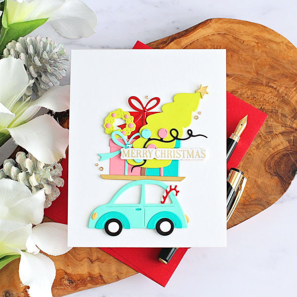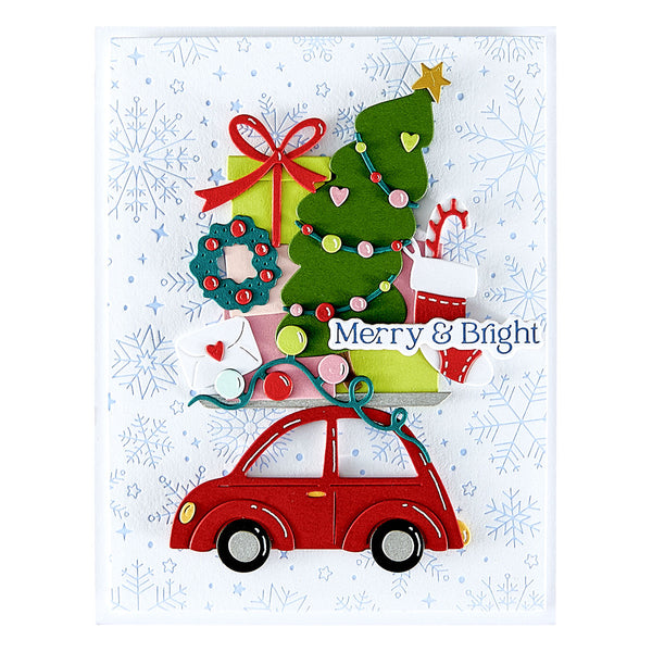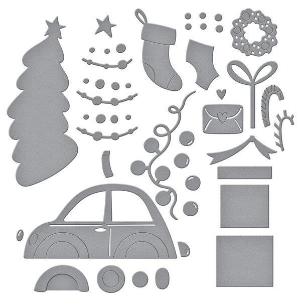 Yuletide Ride Etched Dies are part of the Wonderland Collection. With this set of 23 thin metal cutting dies makes a crazy holiday ride with all kinds of seasonal items on top of this cute car! Accessories include holiday tree with all its décor, presents accented with bows, a wreath, a stocking, a string of lights and more!
