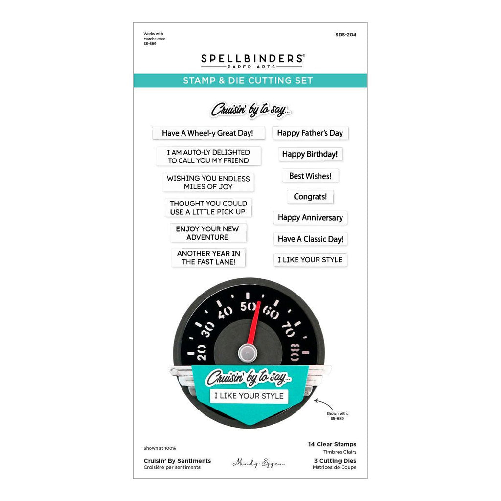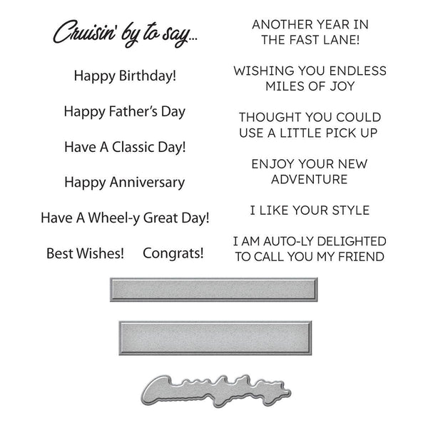 Cruisin' By Sentiments Stamp & Die Set is from the Classic Road Legends Collection by Mindy Eggen. The set of 14 phrase clear stamps and three thin metal cutting dies can be used as a stand-alone stamp set but is designed to work with S5-689 Speedometer Die Set in the label area. The two dies are sentiment strips with varying heights and the third coordinates the “Cruisin’ By to Say” sentiment.