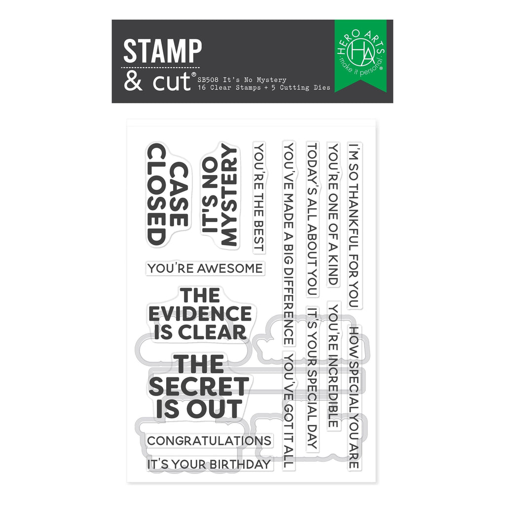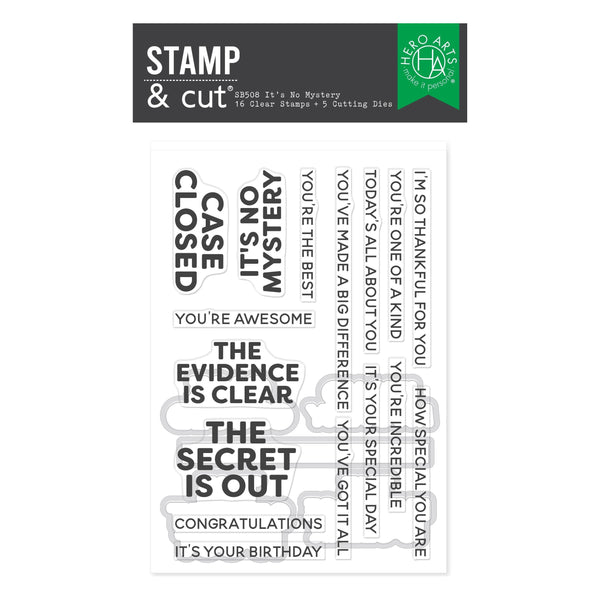 The It's No Mystery Stamp & Cut Set from the Case Closed Collection includes all the sentiments you need to tell the right story. You'll get four large mystery-themed sentiments, including 'The Evidence Is Clear', 'The Secret Is Out', 'Case Closed' and 'It's a Mystery' - plus the matching dies to cut them out perfectly. Once you've stamped your large sentiment, customize your card for any occasion with the sub-sentiments. Whether you're celebrating a birthday or showing your thanks, this set of 16 clear stamps solves the mystery of what to say! Combine with DF245 Magnifying Glass Die Set to give your message some extra emphasis.