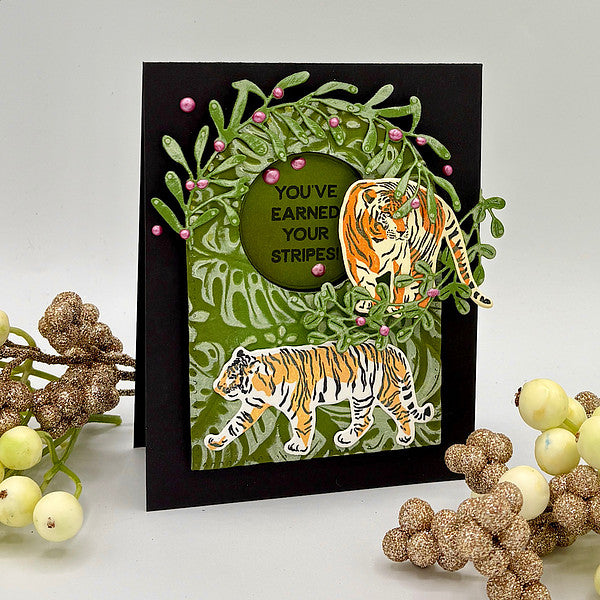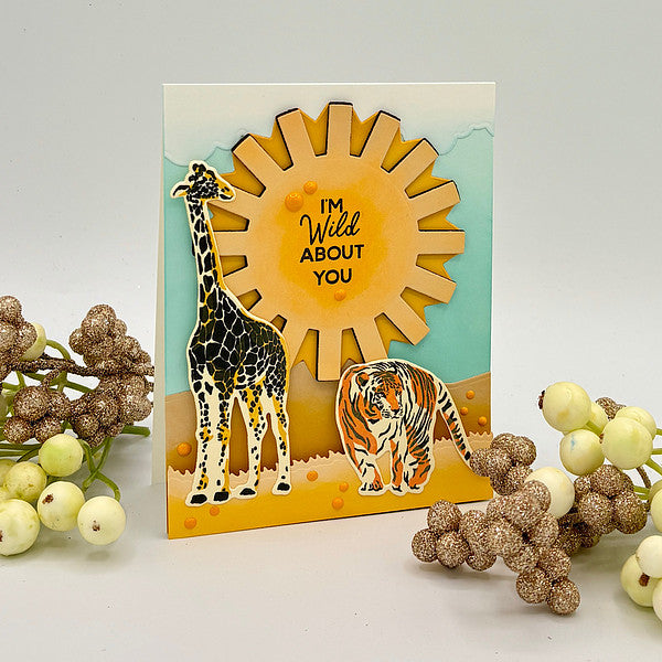 It's safari time with the Wild About You Stamp & Die Bundle! The bundle includes HUR90656 Ranger Wild About You Clear Stamps and the coordinating S5-708 Wild About You Etched Dies. This set of 17 clear stamps include layering stamps to add beautiful dimension and color to classic safari animals. Also included are 7 sentiment stamps, including several fun puns such as "You've Earned Your Stripes" and "Go Get 'Em, Tiger!' The coordinating set of 5 dies perfectly cuts out all the animals from the stamp set - giraffes and zebras and tigers, oh my!
