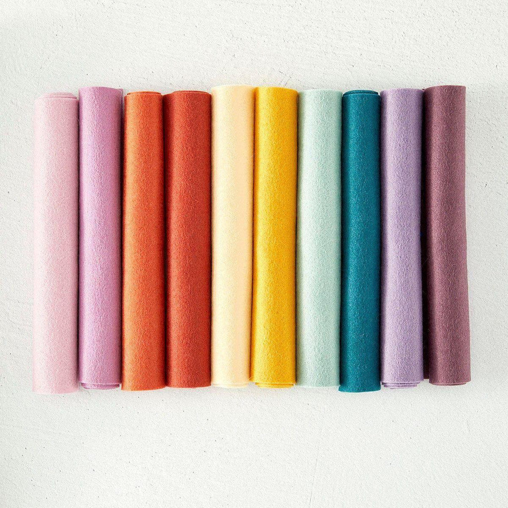 Merino Wool Felt Sheets - Trend Collection is 100% Merino Wool felt material and comes in a pack of 10 assorted colors. The colors include one each of Rose, Chiffon, Clay, Autumn, Custard, Sunflower, Aqua, Stormy, Heather, and Iris.