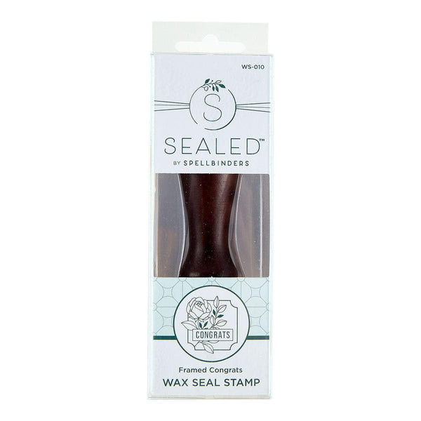 Framed Congrats Wax Seal Stamp is part of the Sealed by Spellbinders Collection. It has one wooden handle that supports a 1" round brass seal stamp design on its end. The stamp design has a clipped cornered square label in the center layered with a rose and CONGRATS on top. Add elegant and unique wax seal accents to your cards, envelopes and more!