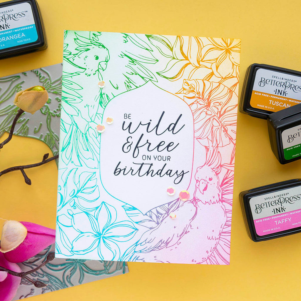Wild & Free - BetterPress Plate of the Month - Released May 2024 to our BetterPress Plate the Month Club creates a tropical cardfront with a happy birthday sentiment. Use to create cards, décor, gift card holder, gifts, and more!
