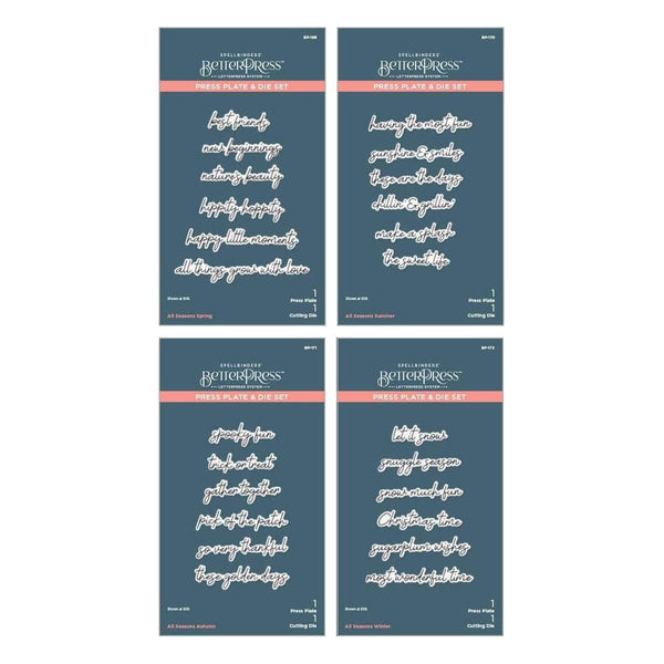 If you are an all-season crafter, this All Seasons Sentiments BetterPress Bundle from the All Seasons Scrapbooking Collection might be for YOU! The bundle includes BP-169 All Seasons Spring Press Plate & Die Set, BP-170 All Seasons Summer Press Plate & Die Set, BP-171 All Seasons Autumn Press Plate & Die Set, and BP-172 All Seasons Winter Press Plate & Die Set. Each set would be a perfect fit for each season so why not collect them all? Ink the plates with the BetterPress Ink to be pressed against the BetterPress Cotton Card Panel and Sheets for a crisp letterpress design.