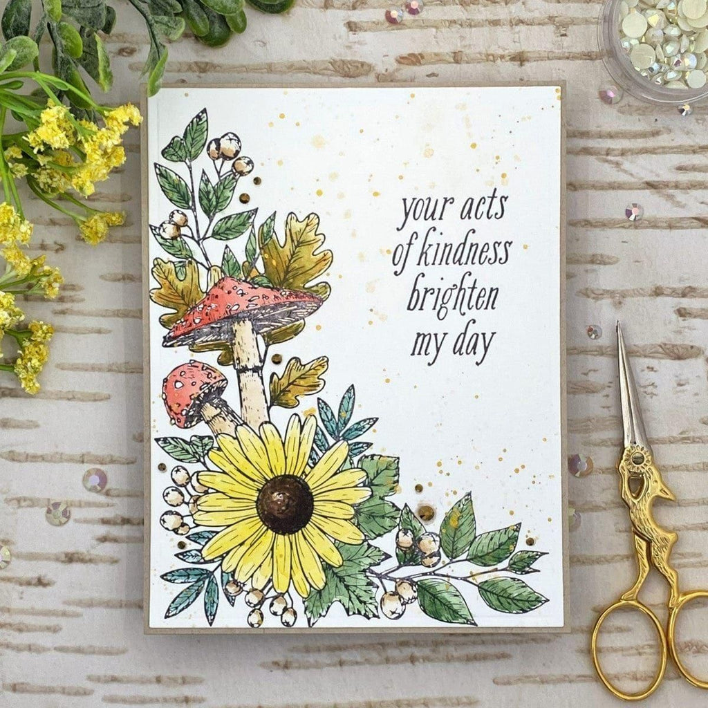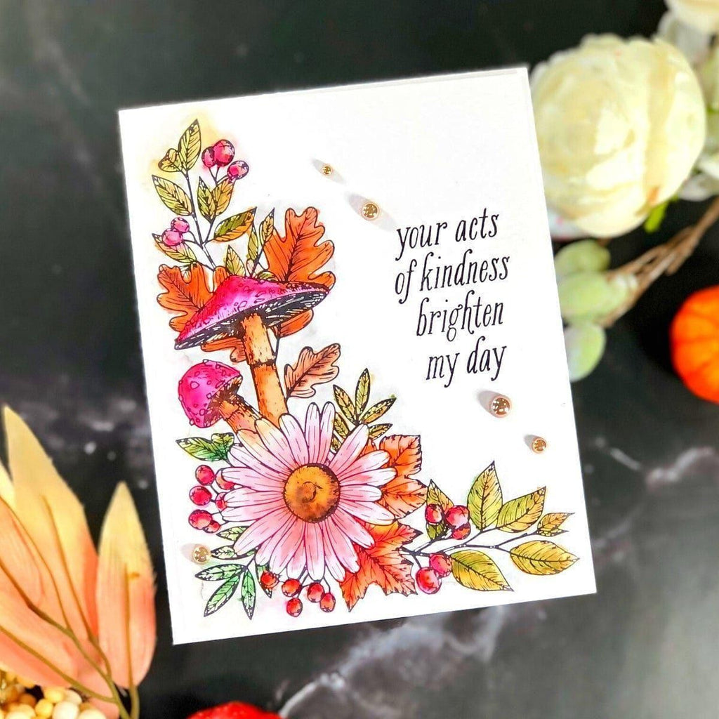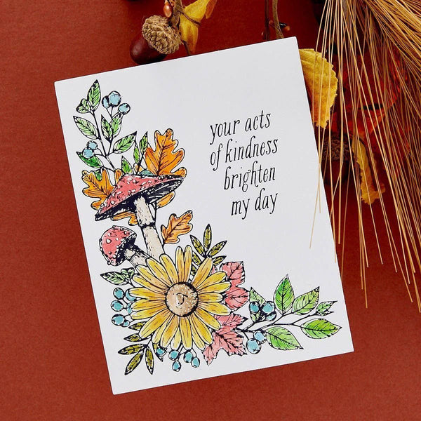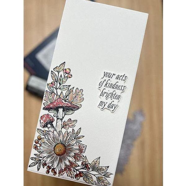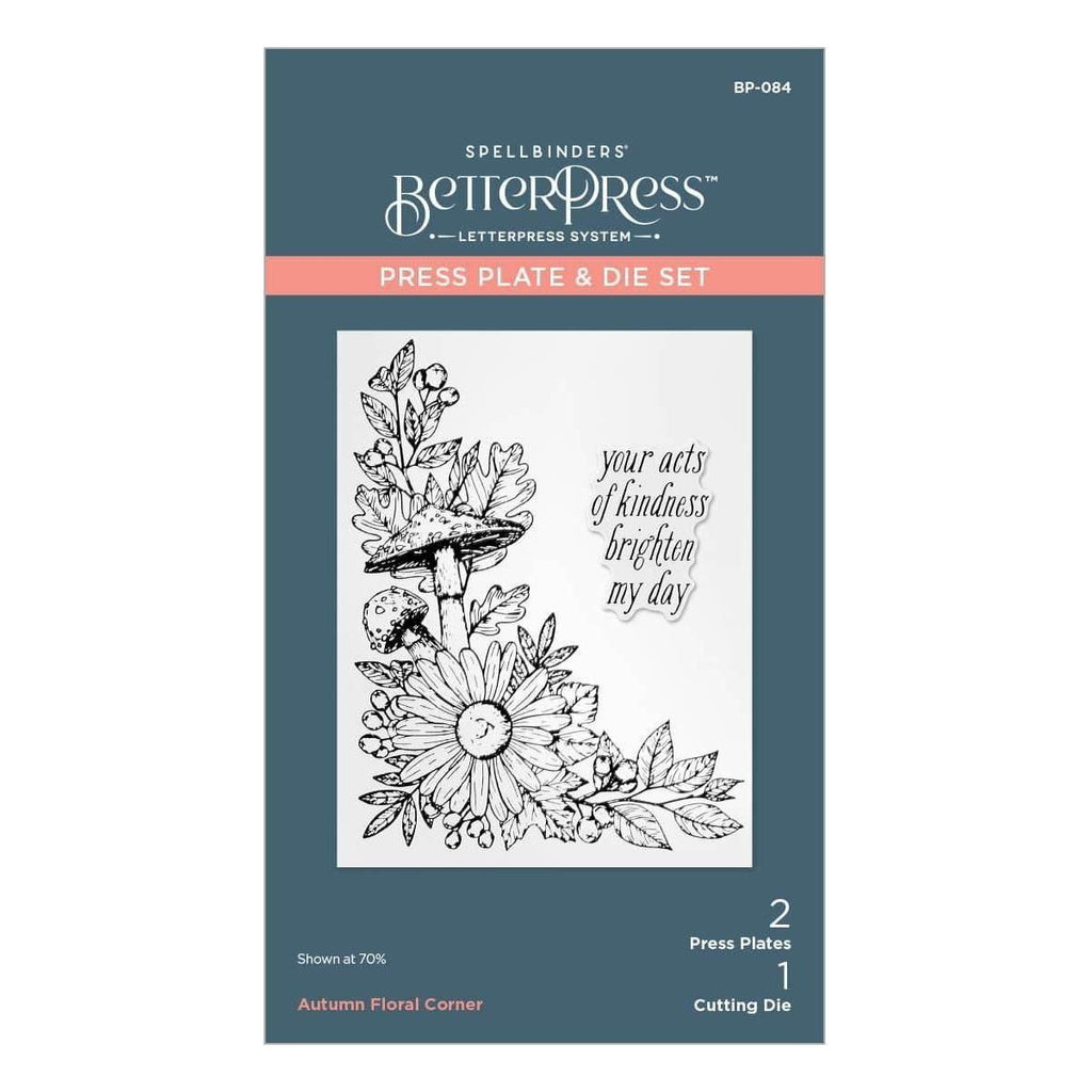 Autumn Floral Corner Press Plate & Die Set is from the BetterPress Autumn Collection. The corner motif has a wonderful combination of autumn leaves, flowers, and mushrooms. Fills most of an A2 size (4.25 x 5.50 in.) card front…just beautiful! This set of two press plates and one thin metal cutting die includes the corner design, as well as a sentiment and its outline die to cut and make it stand out. Ink the plates with BetterPress Ink to be pressed against the BetterPress Cotton Card Panel and Sheets for a crisp letterpress design.