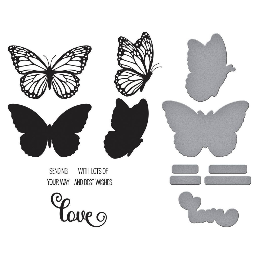 Butterfly Silhouettes Registration Press Plate & Die Set is part of the Wildflowers Collection by Lisa Horton. The set of six press plates, four thin metal cutting dies, and one mylar printed registration template come together to create two beautiful multi-color butterflies and sentiments. The four plates impress two butterflies, each with a silhouette and detailed design. One is a front profile butterfly design, and the other is a side profile butterfly that comes together with the help of the registration template. The other two plates have a 'Love' word and four supporting sentiments: Sending, Your Way, and Best Wishes, and With Lots of.