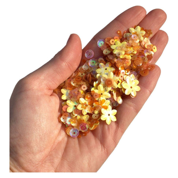 Soliel Sequinz is a craft embellishment mix from Buttons Galore and More. Buttons Galore's craft sequins are made from the highest quality PET and PVC material for a superior look. This set of sequins includes different sizes of flower sequins, as well as iridescent circles, all in an orange and yellow hue, perfect for shaker crafts and adding sparkle to all kinds of craft projects. They are great for use on scrapbook pages, papercrafts, kids crafts, creative memories, clothing, cell phones, nail art and many other arts and craft creations. With a generous 15 grams in each pack, you will have plenty of sequins for your diy projects.