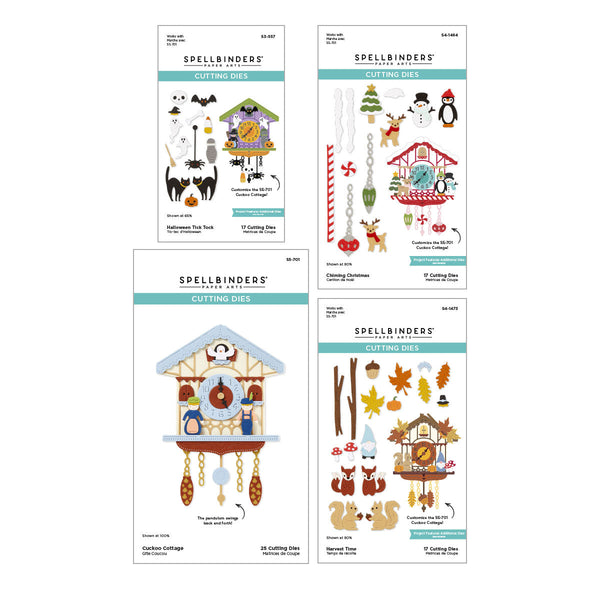 Cuckoo Cottage Die Bundle is part of the Cuckoo Cottage Collection. Go Cuckoo with this bundle and get all the die sets in the collection to create all the clocks you want! Perfect for those of us who can’t make up their mind…this bundle does it for you! It includes S3-557 Halloween Tick Tock, S4-1464 Chiming Christmas, S4-1473 Harvest Time, and S5-701 Cuckoo Cottage.