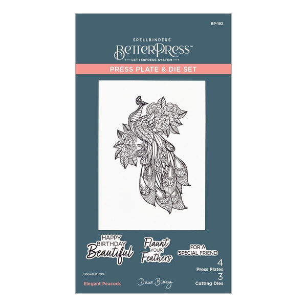 Elegant Peacock Press Plate & Die Set is from the Peacock Paradise Collection by Dawn Bibby. The largest press plate imprints a fabulous detailed peacock with floral accents on each side. Also included are three sentiment plates with matching thin metal cutting dies to pop up and highlight the greeting. Ink the plates with the BetterPress Ink to be pressed against the BetterPress Cotton Card Panel and Sheets for a crisp letterpress design.