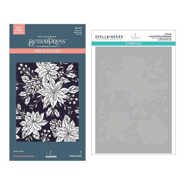 Festive Poinsettias BetterPress and Stencil Bundle is part of the Amaryllis Christmas Collection by Yana Smakula. It includes BP-226 Festive Poinsettias Press Plate and STN-098 Layered Festive Poinsettias Stencil. With the durable mylar stencil set, each layer adds depth of color to bring the design to life!