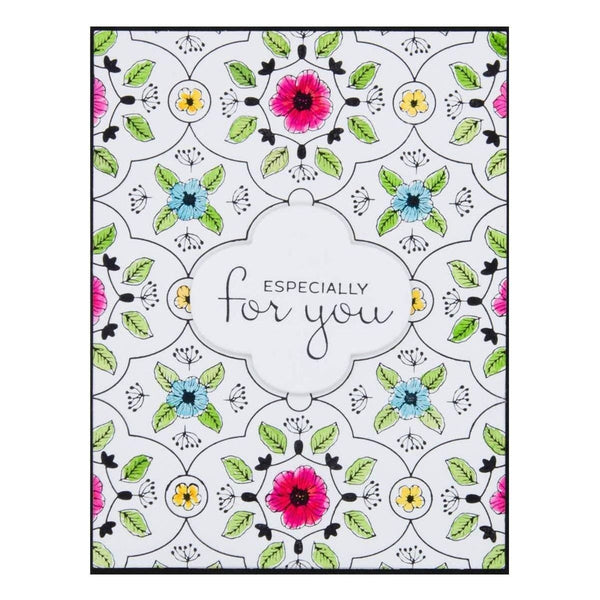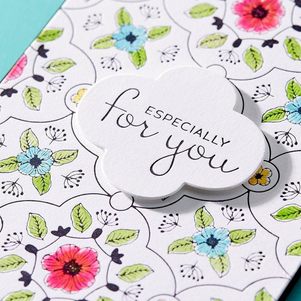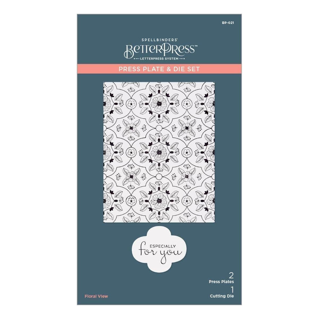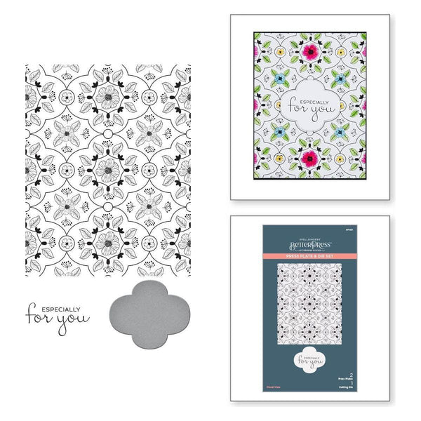 Floral ViewPress Plate & Die Set is from the BetterPress Collection by Spellbinders includes a playful floral motif background design and an Especially for You plate verse. The sentiment can be die-cut out with a frame die to layer on top of the A2 size background. Ink the plate with the BetterPress Ink to be pressed against the BetterPress Cotton Card Panel and Sheets to create a crisp letterpress design.