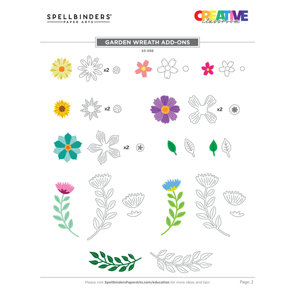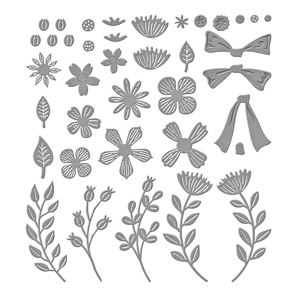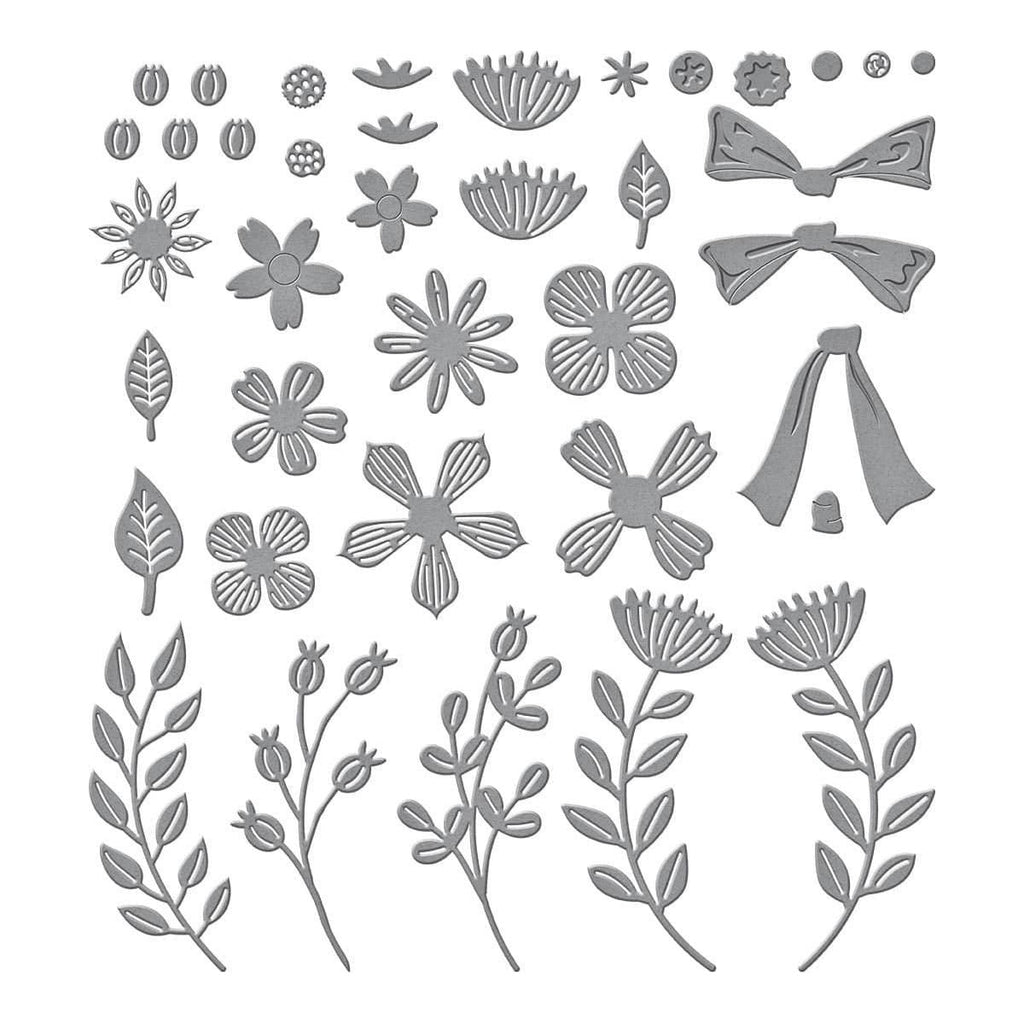 Garden Wreath Add-Ons Etched Dies are part of the Beautiful Wreaths Collection by Suzanne Hue. This set of 27 thin metal cutting dies are full of sweet floral blooms with leaves, sprigs, and a bow tie. Designed to work with S5-595 Build-A-Wreath Set, it can make a wonderful spring-themed motif. It can also stand alone to create lovely clusters and accents.