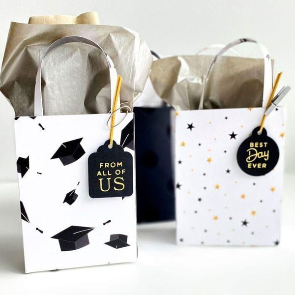 The Gift Bag Etched Dies is part of the Celebrate You Collection. This set of two thin metal dies assembles into a super cute bag. Perfect to hold treats, gift cards and other fun small items. Perfect for birthdays, graduation, or other special occasions. Simply die-cut two pieces of each die shape to create your bag. Use either tags, labels, stencil, embossing folders in the collection to embellish for a wonderful look! When it assembled, the bag without handles measures 1.75 x 3.125 x 4.25-inches.