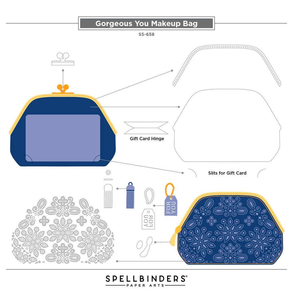 Gorgeous You Makeup Bag Etched Dies are from the Gorgeous You Collection. This versatile set of 11 thin metal cutting dies creates a lovely makeup bag with a choice of a kiss clasp or zippered closure and either a beautiful pin dot design on the bag or to leave it solid. There are other accessories such as a tassel, a gift tag, and to add a gift card to the bag. Another option is to add S6-246 Gorgeous You Makeup pieces for a fun look. Finished Bag size with Kiss Clutch measures 4.89 x 3.72 in./12.40 x 9.40 cm and finished bag size with makeup pieces: 5.77 x 5.40 in./14.70 x 5.40 cm.