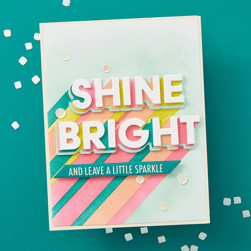 Layered Shine Bright Die & Stencil Bundle is from the Shine Bright Collection by Carissa Wiley and it includes S3-501 Shine Bright Etched Dies and STN-084 Layered Shine Bright Stencils. The stencil set is exclusive to this bundle and will not be sold separately. Send a big bold Shine Bright greeting with this set of four thin metal cutting dies! Each word (Shine and Bright) has an outline die to highlight. When the words are cut, the individual 1” letter drops out so you can use them together with the outline or separately. Add the Layered Shine Bright Stencils for a more dynamic outline and movement.