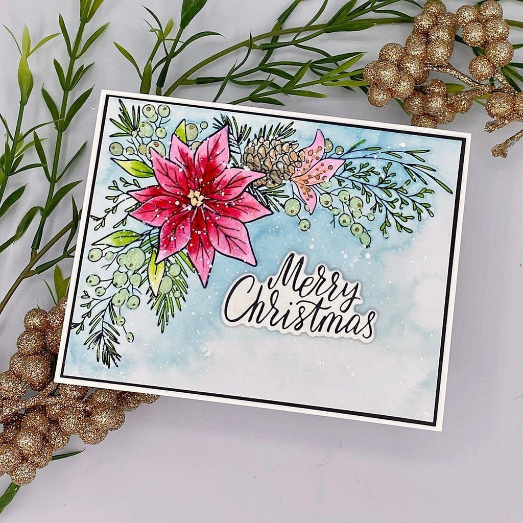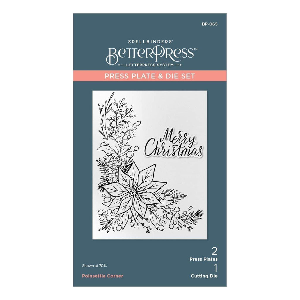 Poinsettia Corner Press Plate & Die Set is part of the More BetterPress Christmas Collection and includes two press plates with one thin metal cutting die. The largest press plate is a stunning Poinsettia cluster tucked in a corner. The other is a Merry Christmas sentiment in a script font and has a coordinating die. A lovely addition to your holiday cardmaking. Ink the plates with the BetterPress Ink to be pressed against the BetterPress Cotton Card Panel and Sheets for a crisp letterpress design.