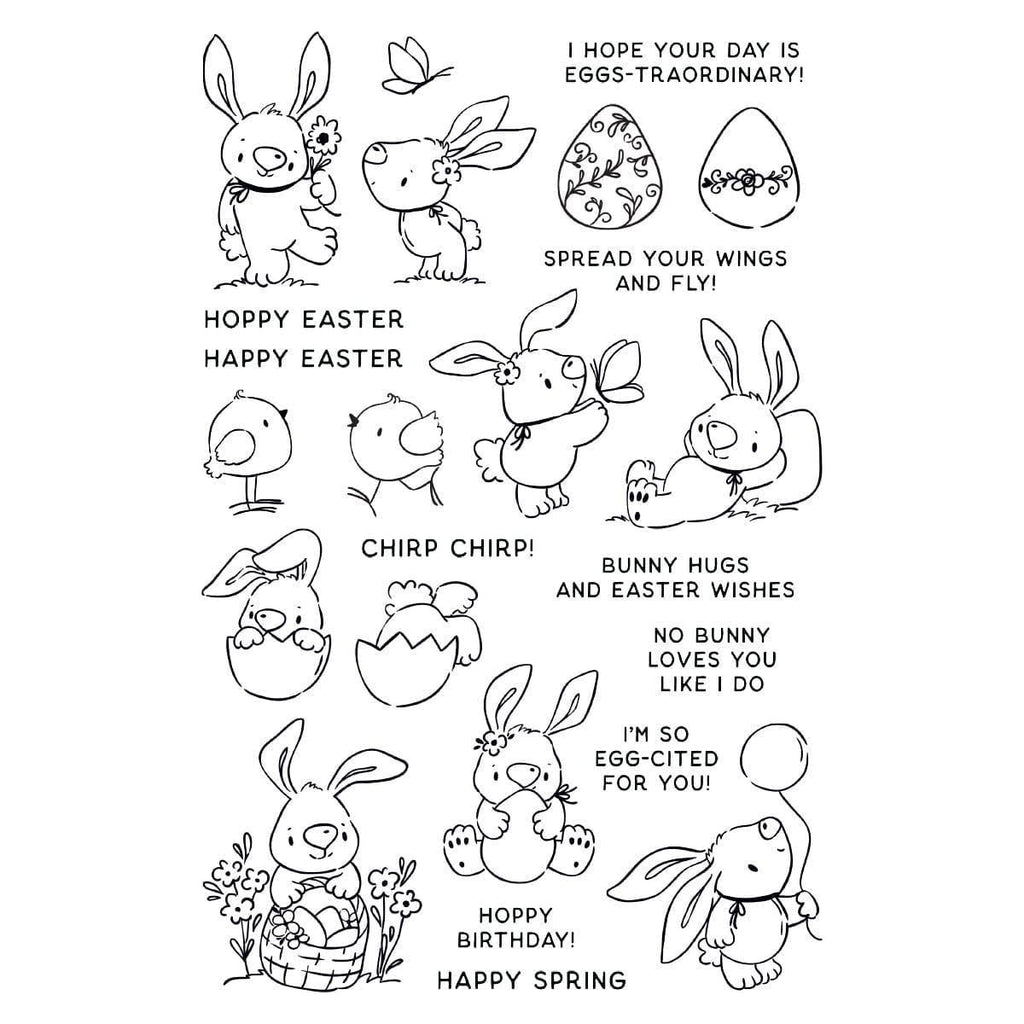 Ranger Easter Bunnies Clear Stamp Set by Simon Hurley create is a set of 22 clear stamps. There are eight different bunny stamps of sweet rabbits getting into springtime shenanigans, as well as eggs, chicks and sentiments - everything you need to create adorable easter cards. This set coordinates with S7-244 Easter Bunnies Etched Dies set to die-cut the stamped pieces for additional versatility. Use these stamps on an acrylic block and they are made in the U.S.A.