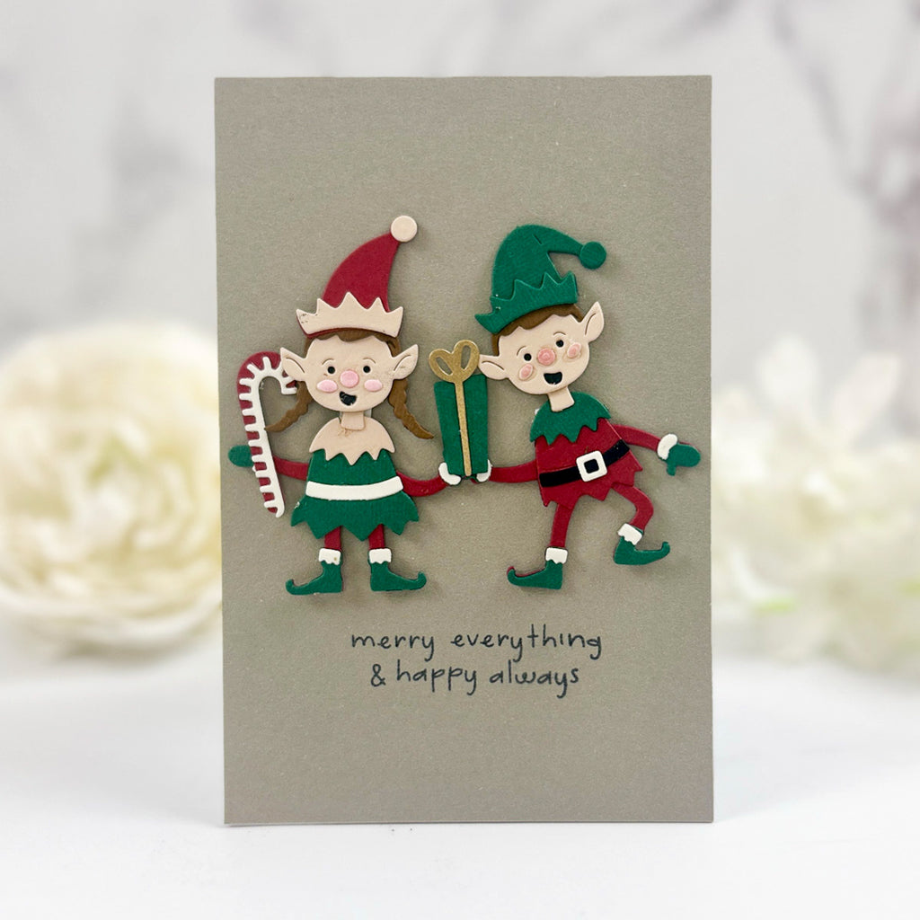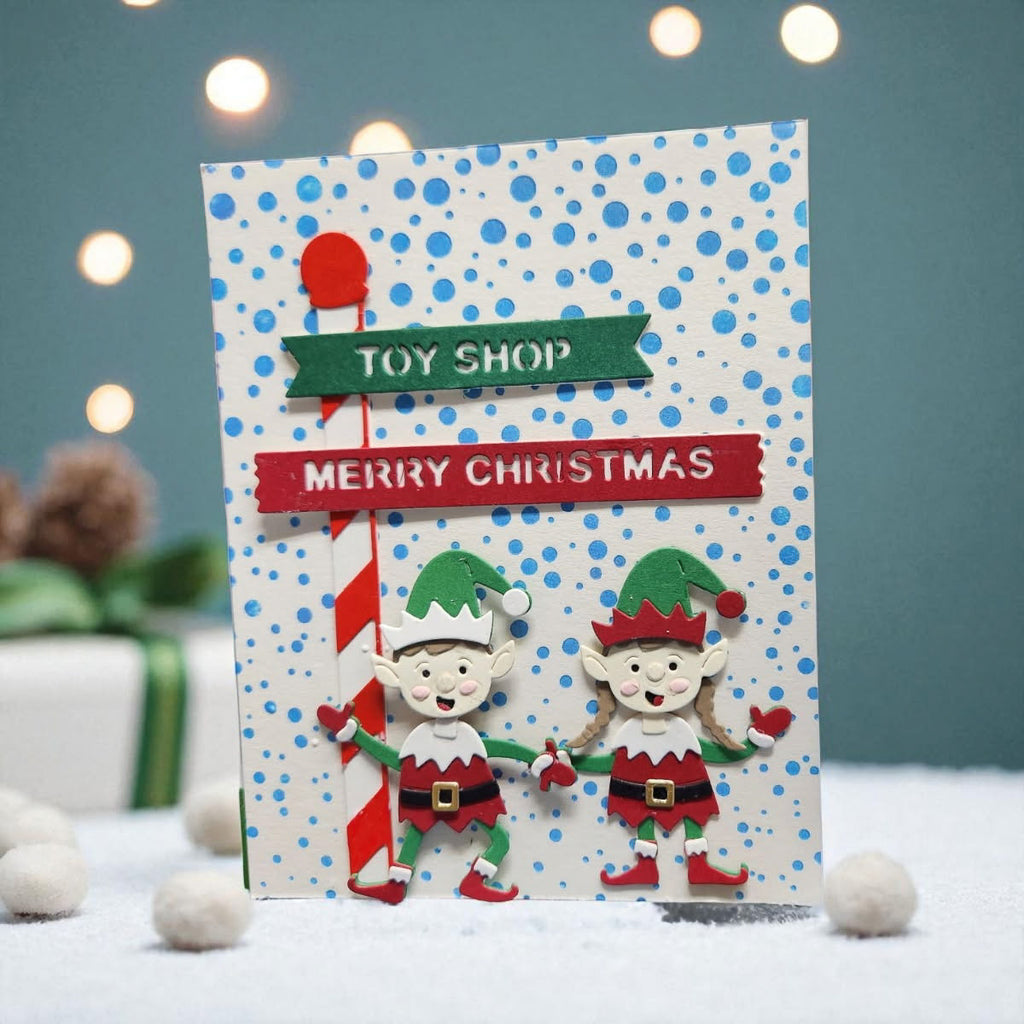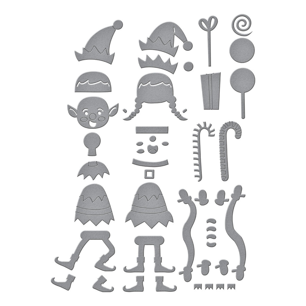 Santa's Elves Etched Dies are part of the North Pole Friends Collection by Simon Hurley. This fun set of 24 thin metal cutting dies creates adorable elves with all sorts of wonderful accessories. Cut a bunch and see what kind of trouble they get into with candies and presents! Dress them up with hats, outfits, mitts and boots. Lots of different design options!