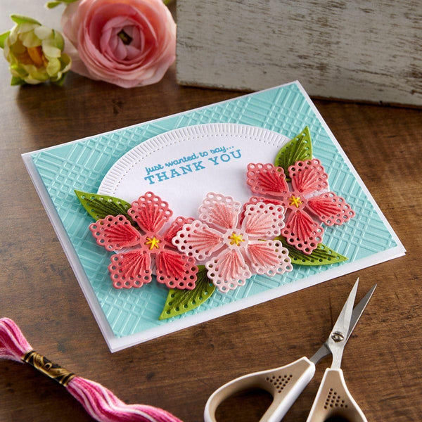 This Stitched Flower Etched Dies from the Spring into Stitching Collection is a set of nine thin metal dies. The Large Flower, Small Flower and Leaf Inserts cut dots to act as a guide for stitching the patterns with embroidery floss and needle. Or use the designs as is because the embossed lines act as faux stitched details. Also included in the set is a Sprig accent. Designer’s Tip: using two strands of six strand DMC Floss or DMC Diamant Metallic Thread and Size 22 Tapestry Needle (sold separately) are recommended.