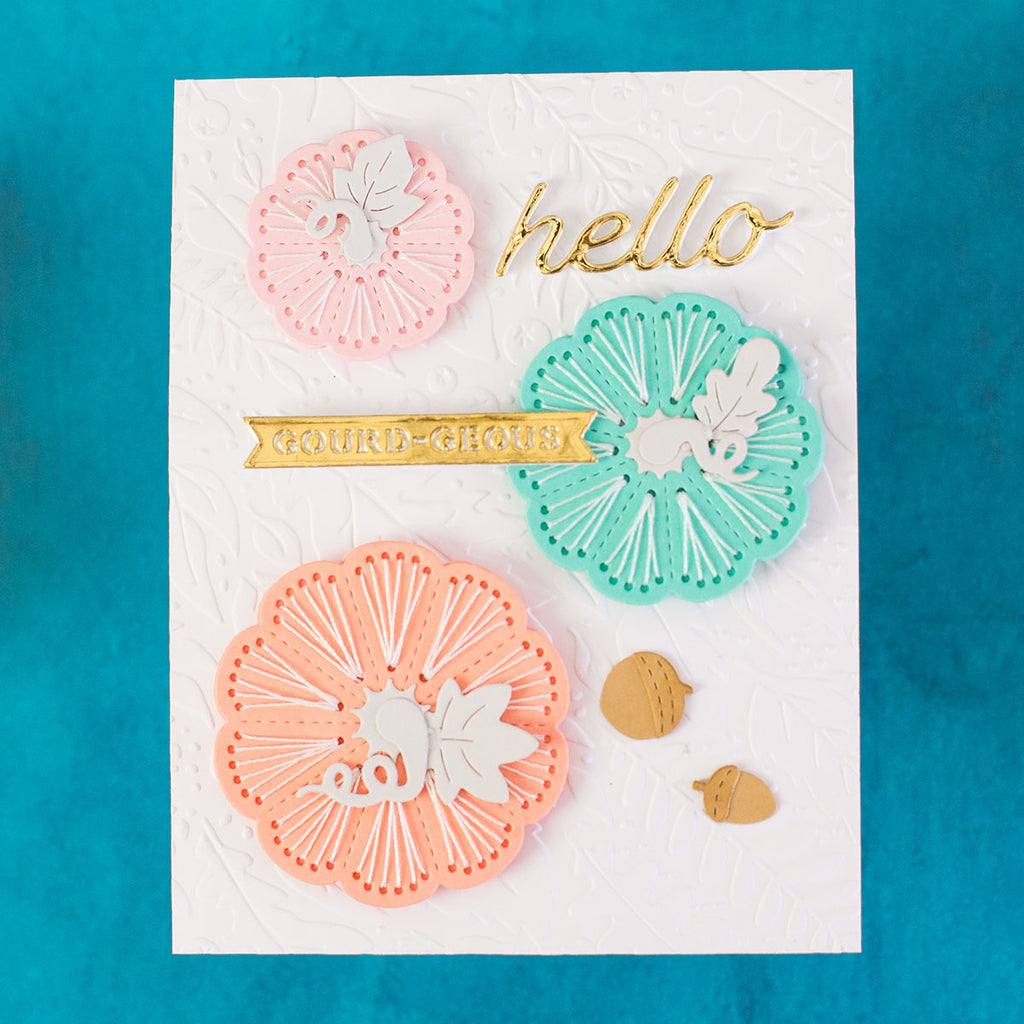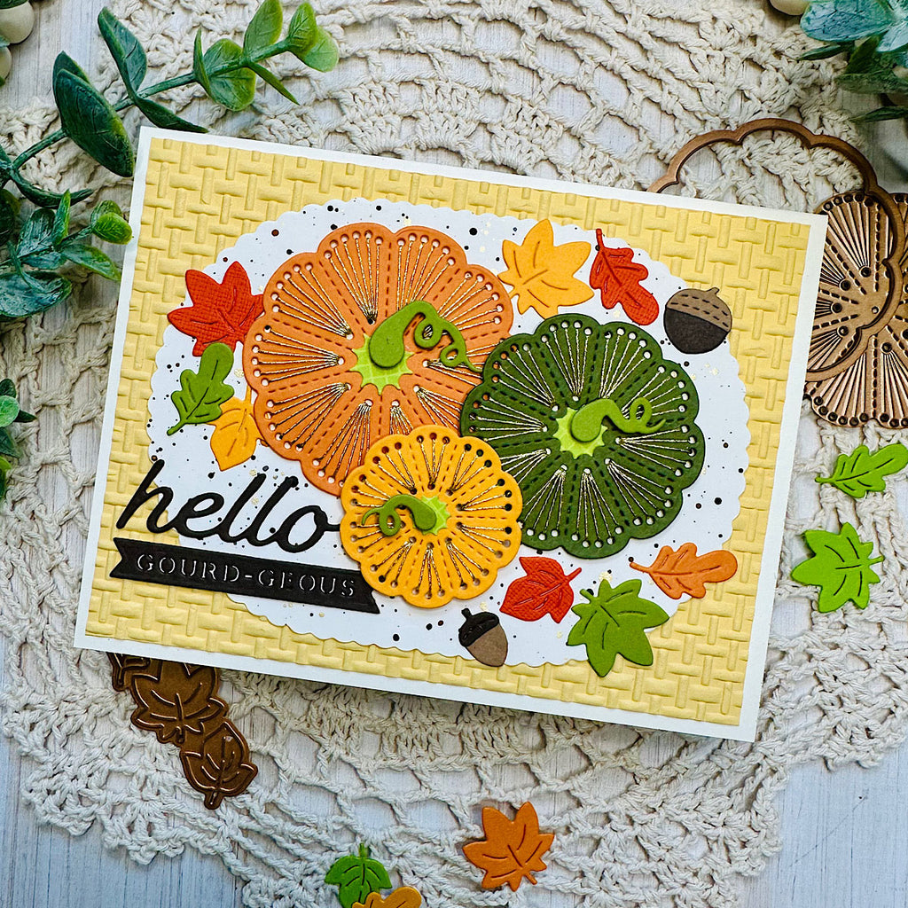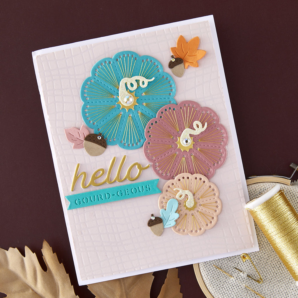 Add texture and warmth to your autumn crafting with the Stitched Pumpkin Tops Stitching Die of the Month. This 14-piece set creates beautifully detailed stitched pumpkins in multiple sizes, complete with swirling vines, leaves, and acorns for layering. A playful “hello gourd-geous” sentiment adds the perfect finishing touch.