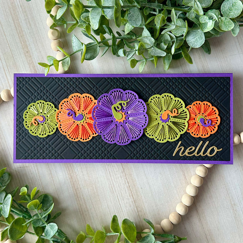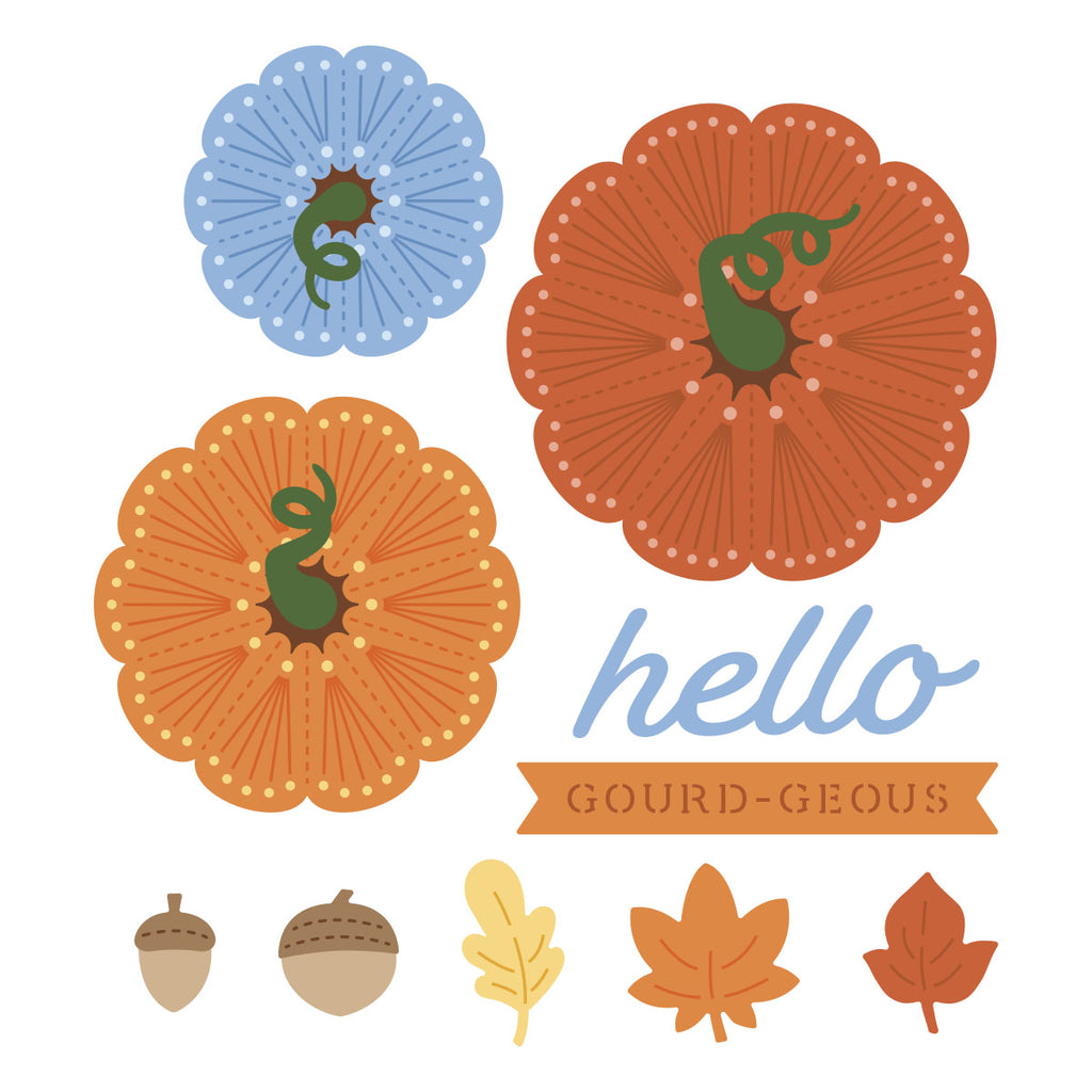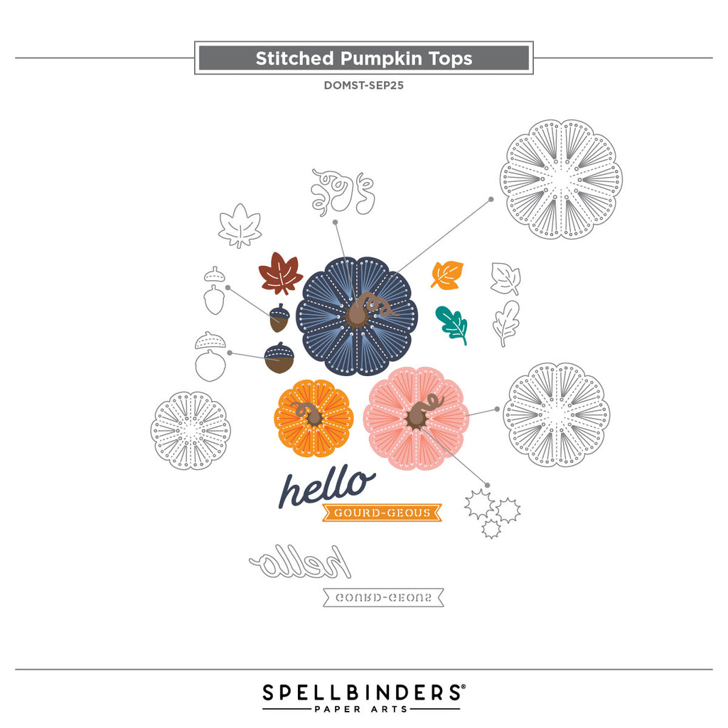 Add texture and warmth to your autumn crafting with the Stitched Pumpkin Tops Stitching Die of the Month. This 14-piece set creates beautifully detailed stitched pumpkins in multiple sizes, complete with swirling vines, leaves, and acorns for layering. A playful “hello gourd-geous” sentiment adds the perfect finishing touch.