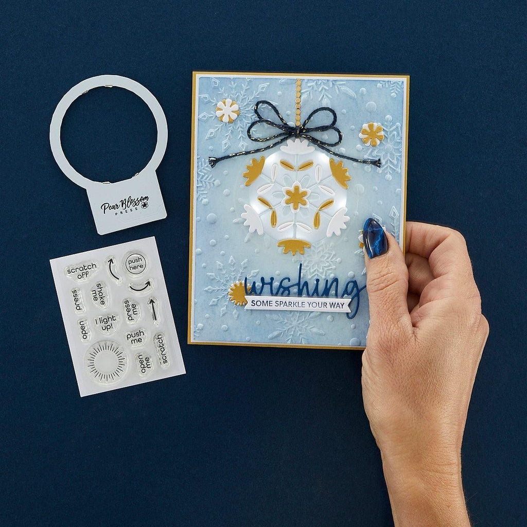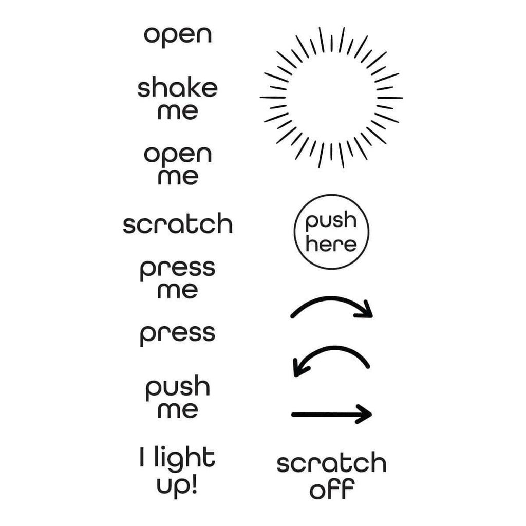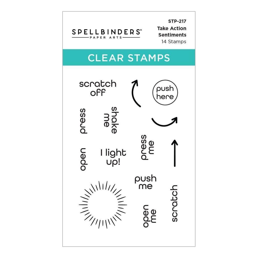 Take Action Sentiments Clear Stamp Set is a set of 14 stamps designed to be used with interactive card elements. With stamps for "Push me," "Shake Me," "Open Me" and "Scratch Me," you'll be able to easily gift playful cards and projects with easy instructions. Also included are arrows and circles to let your recipients know where to press for lights and more.