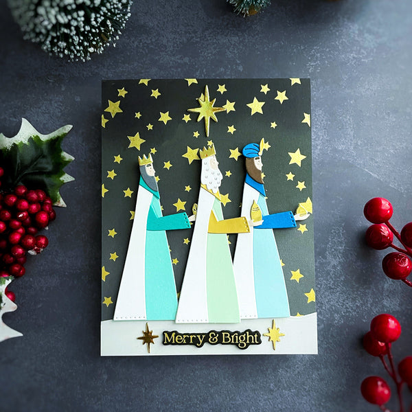 The Three Magi Stamp & Die Set is from the Wonderland Collection. The 11 thin metal cutting dies cut a detailed king shape. The king base has scored lines to fit the other pieces easily in place. Accessories include stars, crowns, gifts and more. The four clear stamps are sentiments: Rejoice, Sending Gifts of Hope, Love and Joy, Peace to You this Holiday Season, and Let the Star Guide Your Heart this Christmas. The stamps are made in the USA with high-quality polymer for perfect impressions every time. Designed to be used with a clear stamp block.