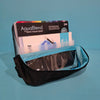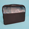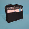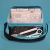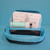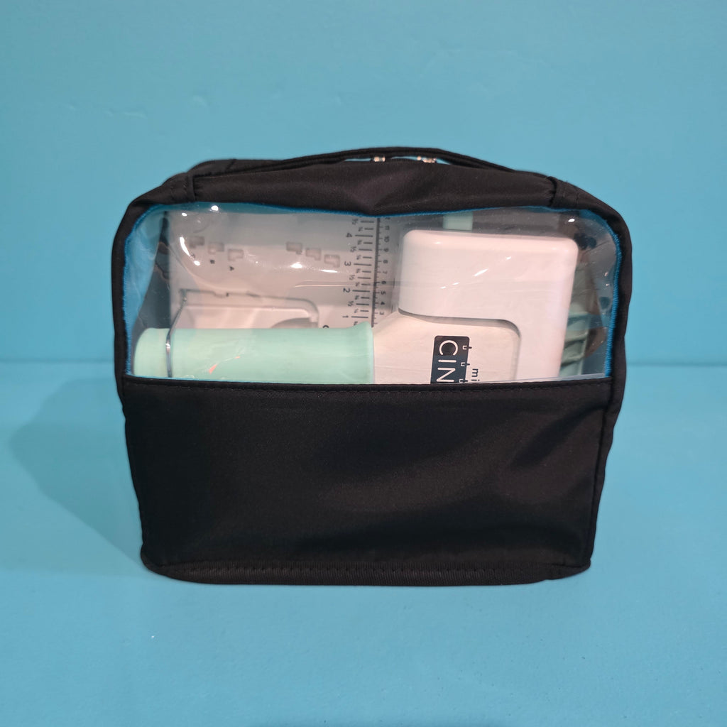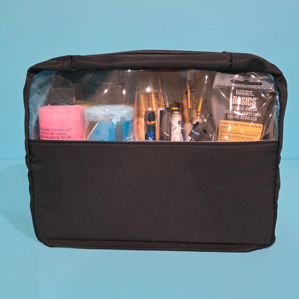 A clear front window gives you a peek inside without unzipping, while the bright blue interior adds a cheerful pop of color and makes contents easy to spot. Inside, you'll find two structured boxes: one that fills the full tote for stable storage, and a second 3" wide box that can be repositioned to act as a divider or organizer for smaller items.