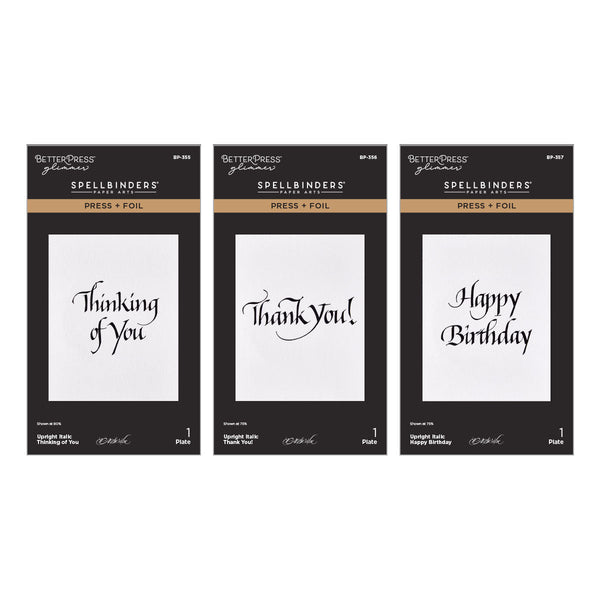 Upright Italic Everyday Sentiments Press + Foil Bundle is part of the Upright Italic Everyday Sentiments Collection by Paul Antonio and includes all the plates in the collection. They are BP-355 Upright Italic Thinking of You Press + Foil Plate, BP-356 Upright Italic Thank You! Press + Foil Plate, BP-357 Upright Italic Happy Birthday Press + Foil Plate. All impresses in a wonderful Italic font penned by the fabulous Paul Antonio! Makes beautiful greetings on card fronts.