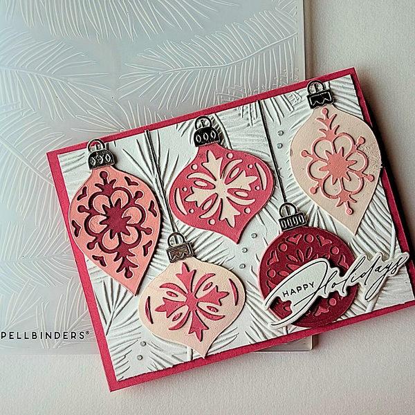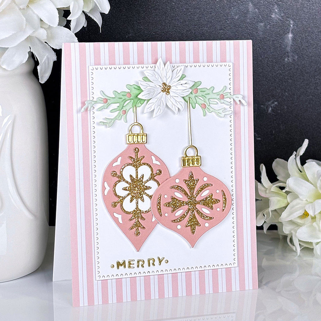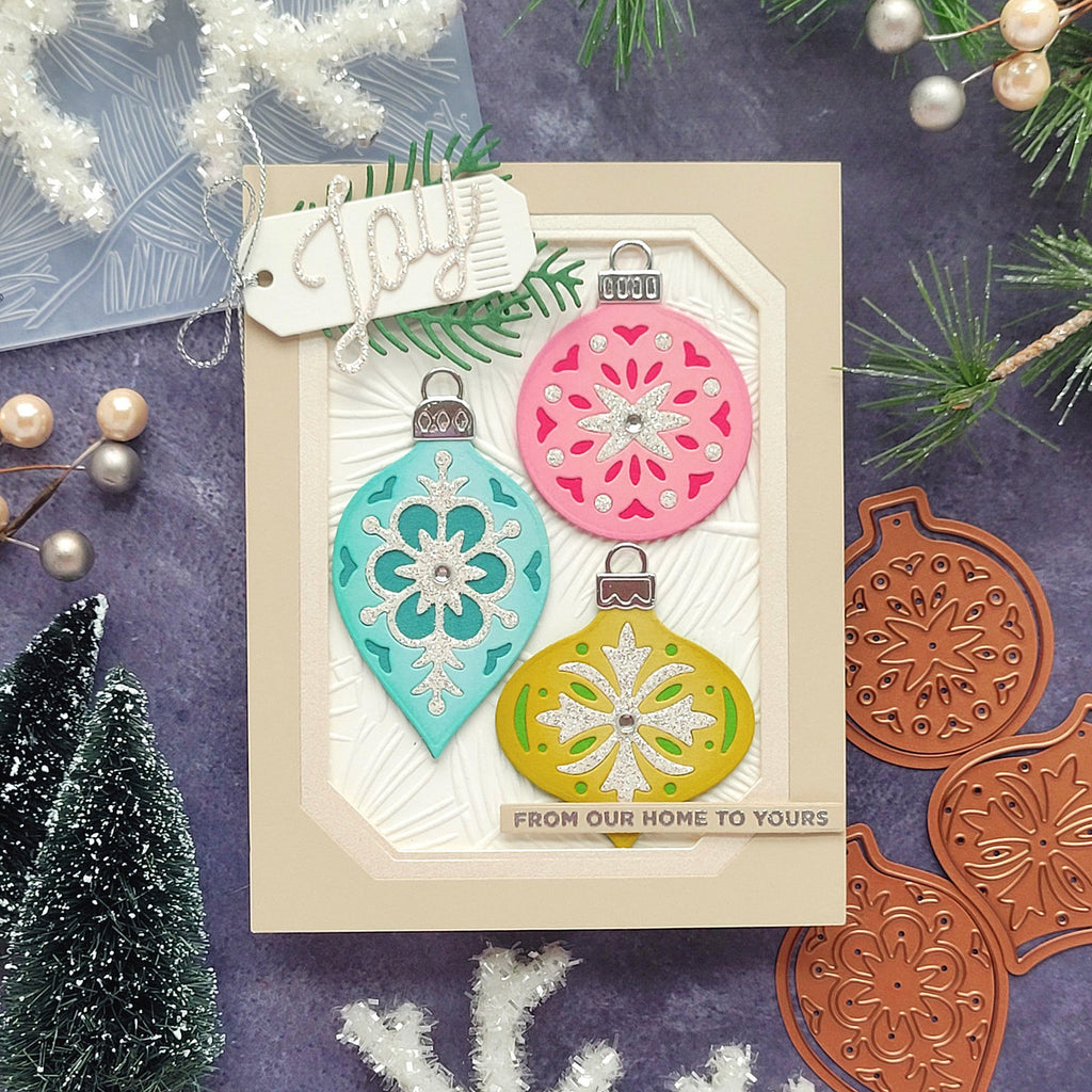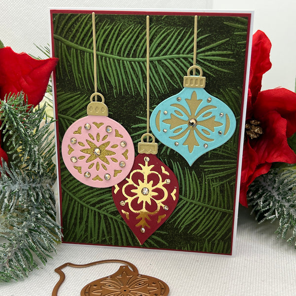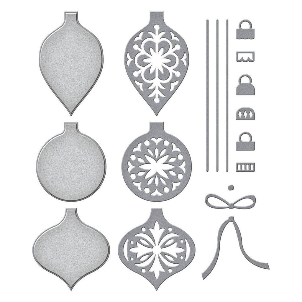 Vintage Layered Ornaments Etched Dies are part of the Timeless Trees Collection by Simon Hurley. Add these sweet and traditional ornaments to your projects! This set of 12 thin metal cutting dies cuts three different kinds (round and two types of finials) from solid shapes to ornate designs when nested with its insert. It also includes toppers, strings and even the bow. Great for handmade ornaments on a tree!
